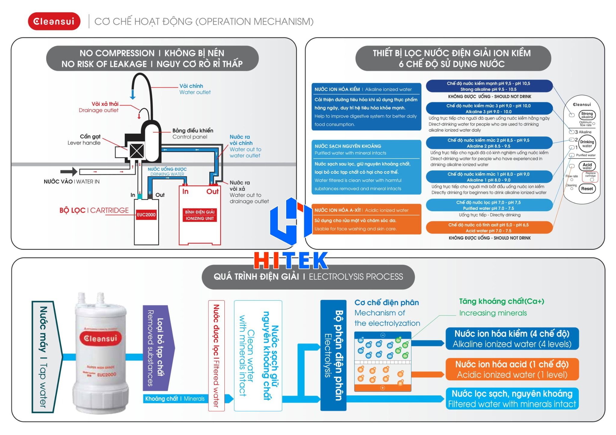 Nước đầu vào sau khi được lọc sạch sẽ vào buồng điện phân công suất cao với 5 tấm điện cực để phân tách các phân tử nước và tái cấu trúc các phân tử nước, nước ION KIỀM được sản sinh ở cực âm, nước ION AXIT (nước có tính axit) sẽ được sản sinh ở cực dương.