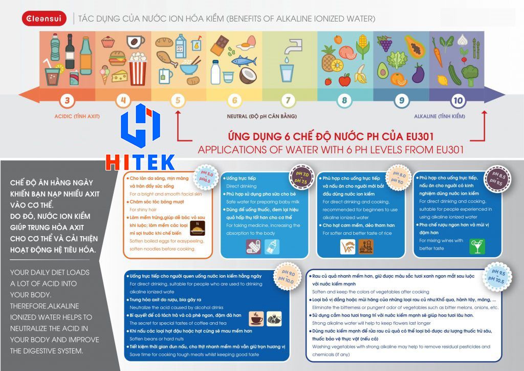Nước ion kiềm có PH-9.5 dùng nấu thực phẩm, làm mềm thức ăn hiệu quả. Nước ion kiềm thẩm thấu qua thức ăn tốt hơn các loại nước khác, và có tác dụng đặc biệt như tạo hương vị và làm thức ăn trở nên mềm hơn.